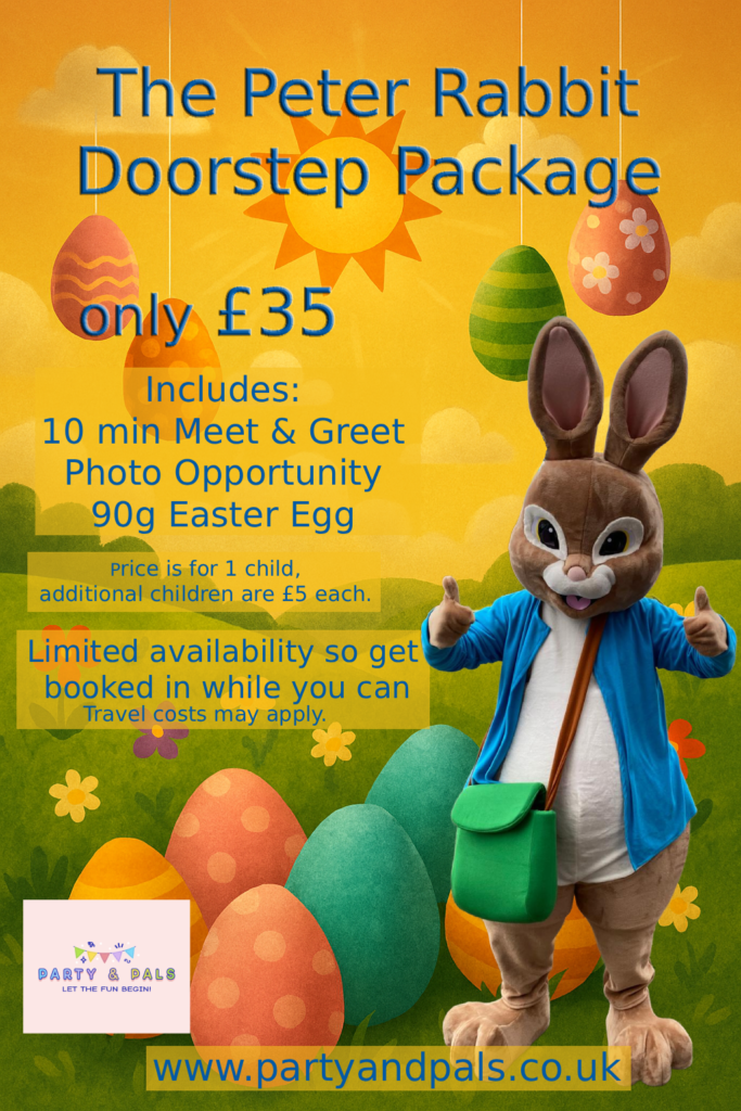 This Easter, Party & Pals is bringing extra magic straight to your doorstep with our charming Easter Mascot Packages. Children can enjoy a special visit from either Peter Rabbit or the Easter Bunny, creating a moment of pure seasonal joy from as little as £35. These doorstep experiences are perfect for families looking to add a sprinkle of Easter excitement without the need for a full party — just a friendly knock at the door and a delightful surprise from one of our lovable rabbits.
